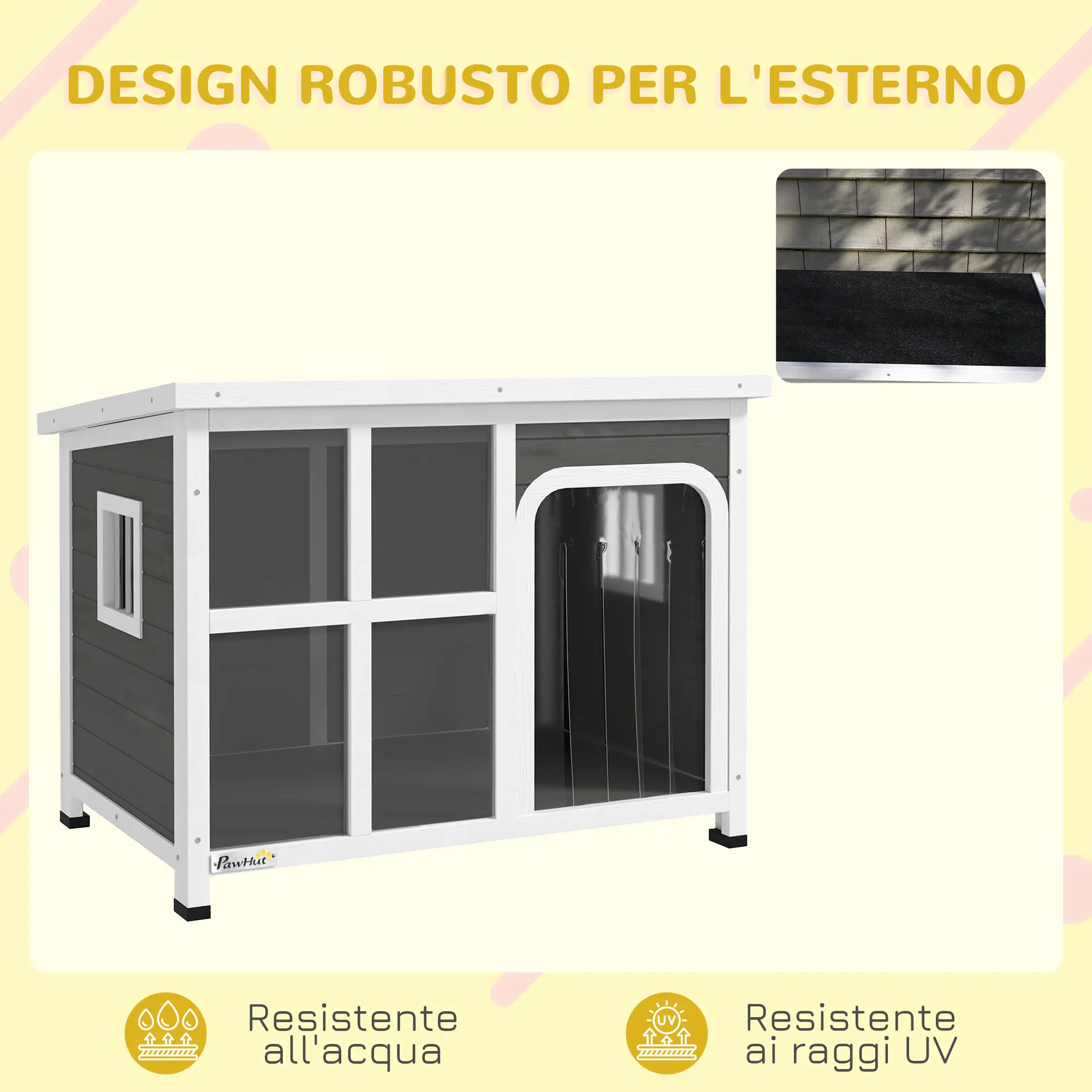 • La vernice impermeabile e il tetto in bitume della casetta per cani offrono protezione dagli agenti atmosferici