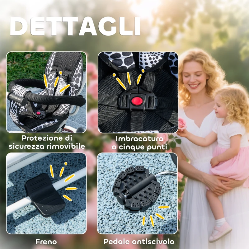 Il nostro triciclo passeggino HOMCOM è il regalo ideale per tanti giri in sicurezza all'aria aperta. La struttura è dotata di tettuccio parasole, barra di protezione, poggiapiedi e un cesto portaoggetti per offrire un'esperienza di guida piacevole e sicura. I genitori potranno utilizzare il maniglione regolabile per accompagnare i bambini a passeggio mentre, quando saranno più grandi e in grado di pedalare da soli, il passeggino può trasformarsi in un pratico triciclo.