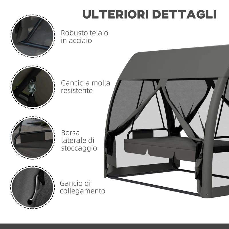 Outsunny Dondolo da Giardino 2 in 1 Convertibile in Letto con Cuscini e Zanzariera, 240x140x197 cm, Grigio