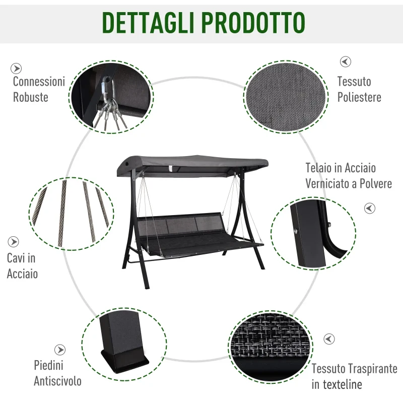Hai bisogno di un luogo tranquillo per rilassarti in giardino, insieme alla tua famiglia e ai tuoi amici? Eccolo qui: questo dondolo da terrazzo a 3 posti Outsunny è perfetto per decorare i tuoi ambienti esterni! Il suo design unico si caratterizza per la seduta a chaise longue con cuscini e tettuccio parasole per un comfort completo. È costruito con materiali resistenti, come metallo e poliestere, per offrirti un prodotto robusto e durevole.