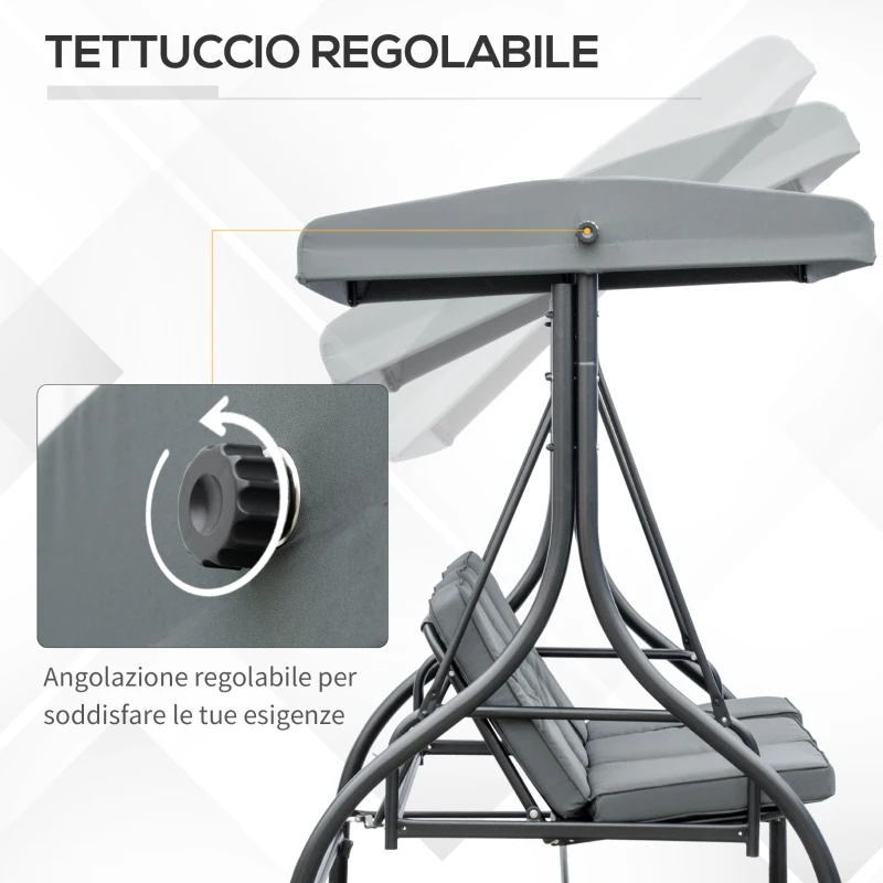 Assicurati un posto confortevole per stare all'aperto in compagnia: il dondolo da giardino Outsunny è la scelta perfetta per tutti! Potete sedervi in 3 oppure trasformare la seduta in lettino, per concederti un pisolino all'aria aperta. Il tettuccio regolabile del dondolo da esterno ti protegge dal sole e il cuscino extra spesso offre tanto comfort per il tuo relax.