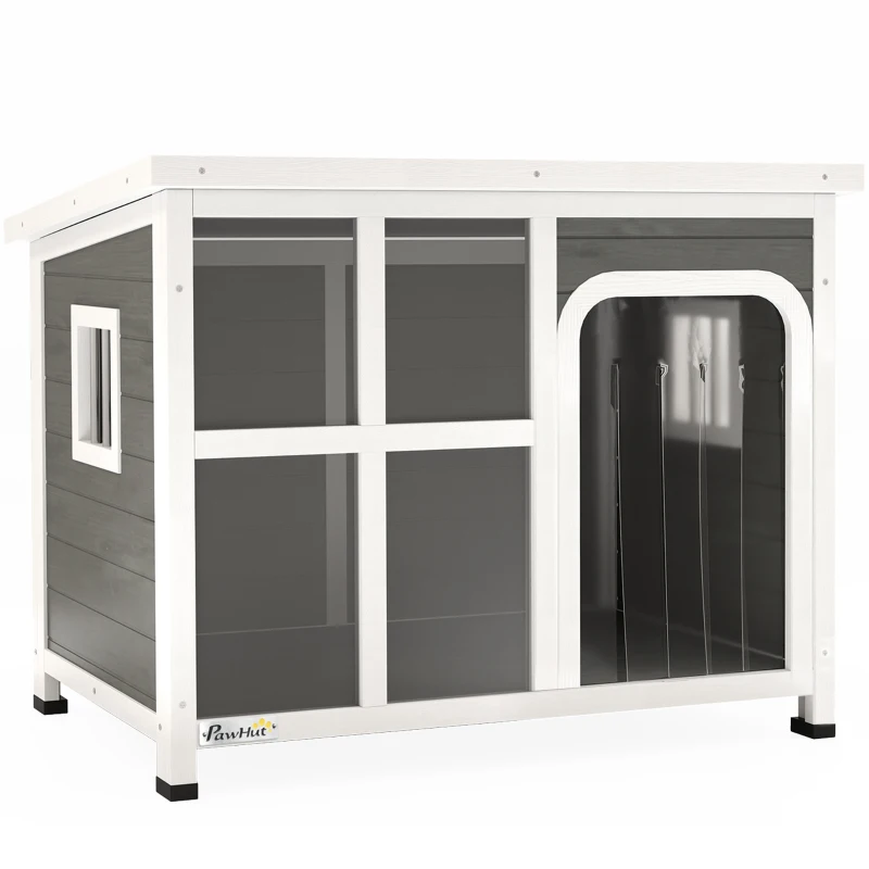 PetHat Casetta per Cani con Finestrelle e Ingresso a Tenda, in Legno di Abete, 90x62x71 cm, Grigio Chiaro