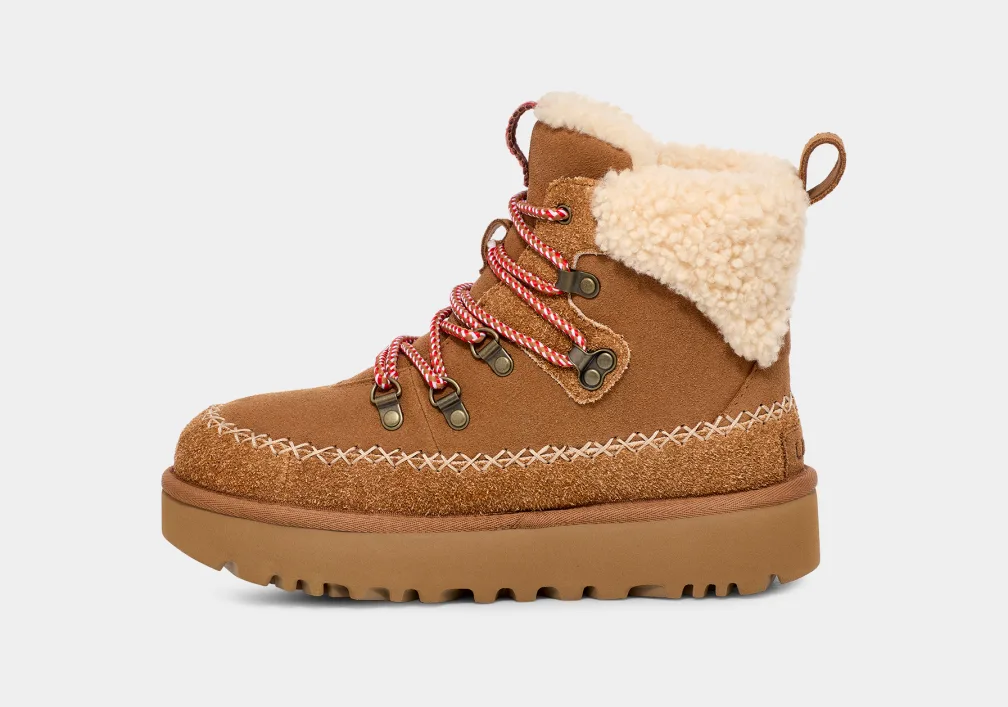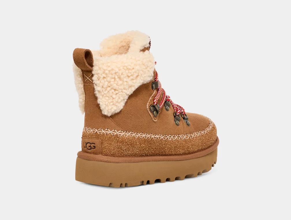 Fusione tra stile da montagna e comfort UGG® di alto livello, gli stivali Classic Alpine stringati appartengono a una categoria a parte. Sono una combinazione di texture iconiche, dal collarino in montone arricciato alla fodera in UGGplush™ rigenerato fino alla tomaia in pelle scamosciata liscia. I lacci rotondi e le doppie cuciture tradizionali conferiscono spessore allo stivale, mentre la suola in EVA da canna da zucchero presenta un battistrada con carrarmato più profondo, che garantisce maggiore trazione durante le camminate sulla neve fresca.