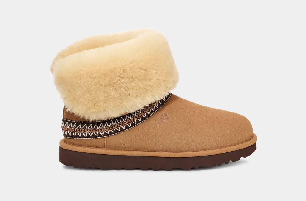 Ti avvisiamo che Classic Short Crescent è talmente comodo e chic che potrebbe tranquillamente rimpiazzare tutti i tuoi altri stivali, le tue scarpe e le tue ciabatte. Realizzato in montone rovesciato e foderato in UGGplush™, quando lo indossi ti regala la sensazione di immergerti in una realtà alternativa, dove il pile regna sovrano. Il gambale curvo si può risvoltare, lasciando il motivo UGGbraid™ esterno in bella vista, oppure può essere portato alto nei giorni più freddi. Completano il modello la suola leggera in EVA da canna da zucchero e il bordo in microfibra scamosciata.