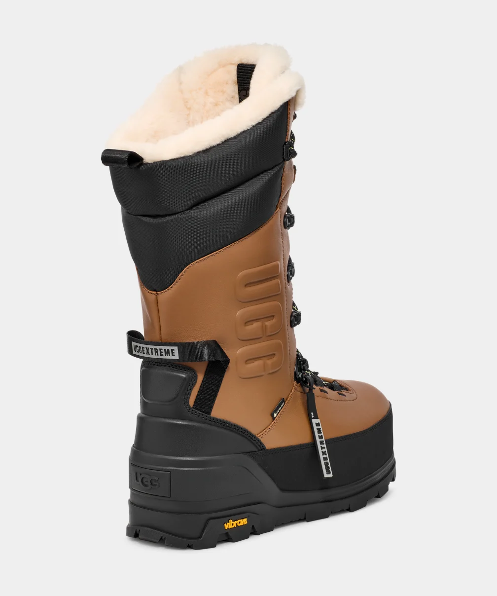 Mix di caratteristiche tecniche a elevate prestazioni, comfort garantito da UGGextreme™ e stile massimalista, questo stivale invernale è pronto ad affrontare il gelo, grazie alla certificazione per temperature fino a -32 °C. È realizzato in pelle impermeabile di prima qualità e include uno strato interno di GORE-TEX® impermeabile ma traspirante. Il collarino in tela presenta un’imbottitura senza piume in poliestere riciclato responsabilmente e può essere risvoltato o tenuto alto per difendersi ancora meglio dalle forze della natura. L’interno è rifinito con il nostro classico misto UGGplush™, che offre la morbidezza e il comfort tipici di UGG®. L’intersuola in EVA da canna da zucchero è completata dalla suola Vibram® ICETREK, per una trazione superiore.
